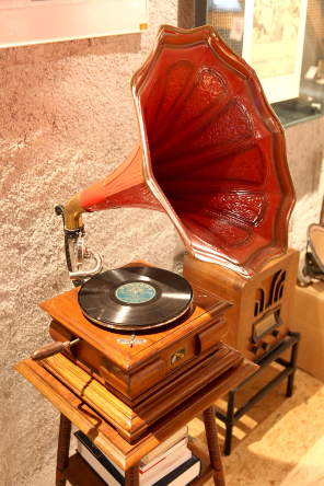 A droite : Une copie récente en provenance d’Inde d’un gramophone.